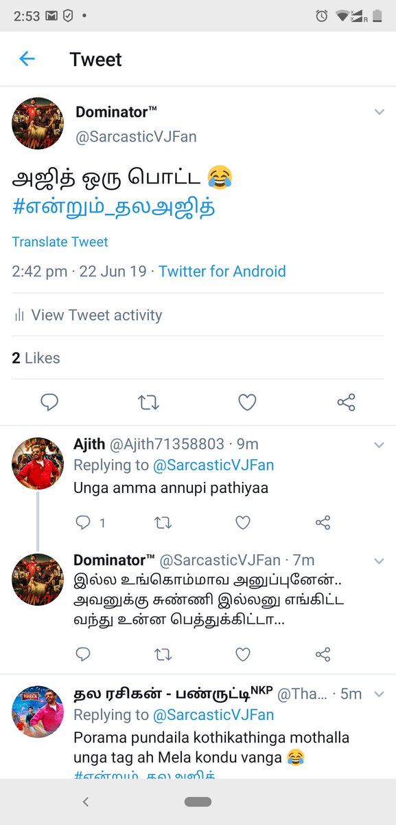 Dominator On Twitter Hence Provee Ajith Fans Are Using Bots Look At Those Bot Ids Liked My Tweet If Your Tweet Has A Word Thala Ajith Whether In Tamil Or English The