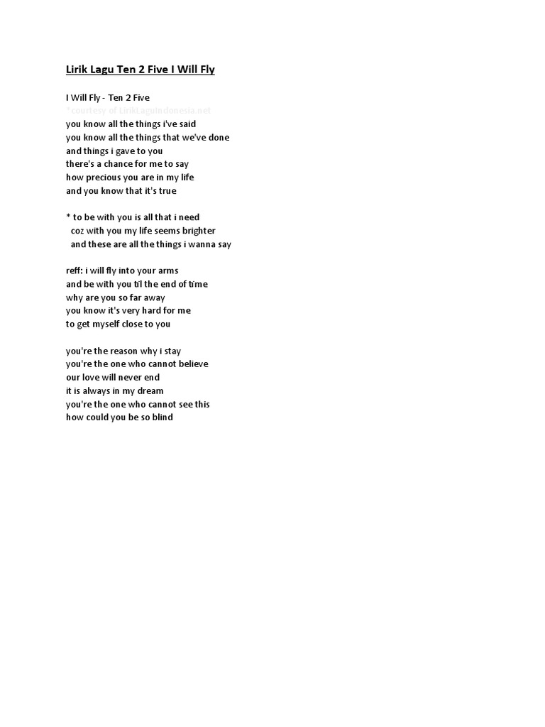 Lirik I Will Fly Ten 2 Five
