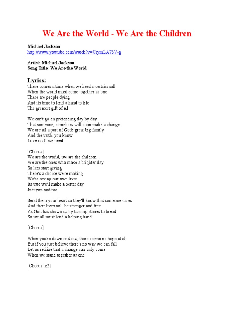 We are the world lyrics michael jackson. There s a choice we re making we re saving our own lives it s true we ll make a better day just you and me. We are the world we are the children. Michael jackson we are the world lyrics. This single was the eighth consecutive number one single on the hot 100 for lionel richie who achieved the same feat during previous seven years.