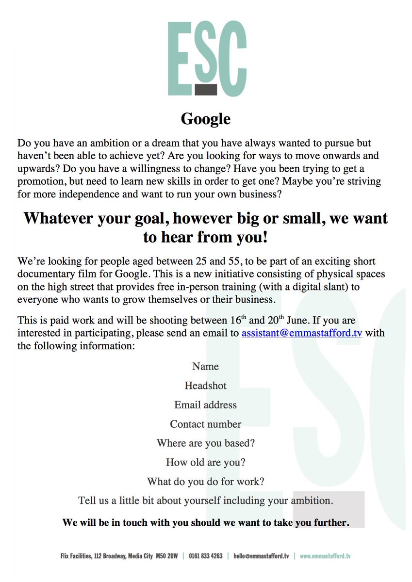 Emmastaffordcastingcdg On Twitter Please Find Casting Details Attached For An Exciting Short Documentary Film For Google We Look Forward To Hearing From You Https T Co K8zql3zdbl